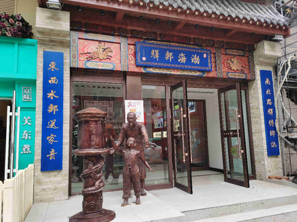 來到位于解放路的渤海郵驛主題郵局,古香古色的門頭下,是身著清代服飾的祖孫倆正在向郵筒里投遞信件的場景雕塑。