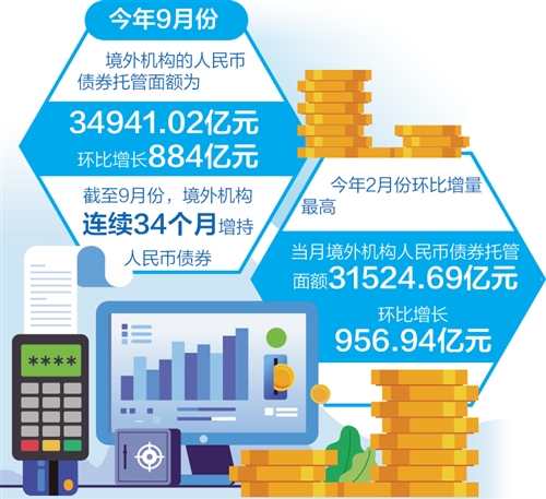 境外機(jī)構(gòu)對(duì)人民幣債券熱情持續(xù)高漲。數(shù)據(jù)顯示,9月份境外機(jī)構(gòu)人民幣債券托管面額為34941.02億元,較8月份增加884億元,環(huán)比增量創(chuàng)今年3月份以來(lái)新高。截至9月份,境外機(jī)構(gòu)已連續(xù)34個(gè)月增持人民幣債券。