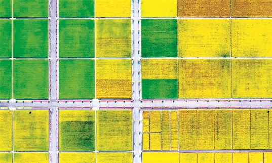 空中俯瞰水稻格田。
