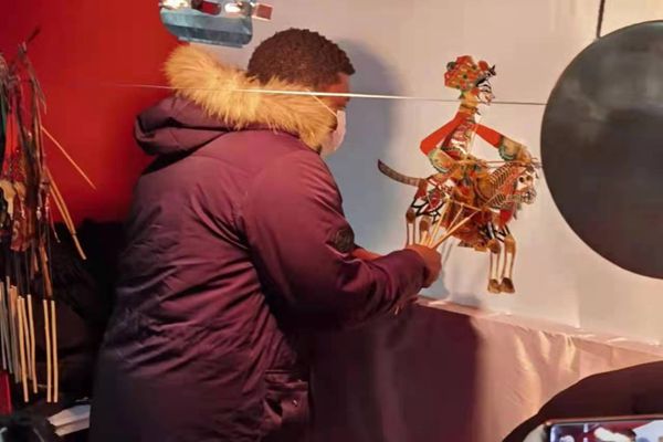在望奎民間藝人表演的皮影戲現(xiàn)場,留學(xué)生們紛紛舉起手機(jī)拍照留念,并發(fā)出了陣陣贊嘆?!捌び笆怯皿H皮制作上色的,大家猜猜它是男生還是女生?”對外漢語系教師張明明帶領(lǐng)留學(xué)生來到皮影戲的后臺,講解皮影的制作工藝和皮影劇的來歷。留學(xué)生們被皮影戲深深吸引,聽得津津有味,并親自操作體驗了一下。