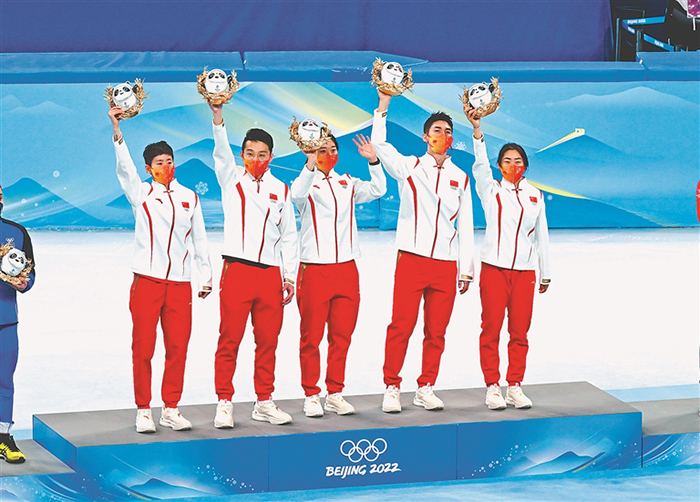 2月5日,中國隊選手在頒獎儀式上。 黑龍江日報全媒體特派記者 郭俊峰攝