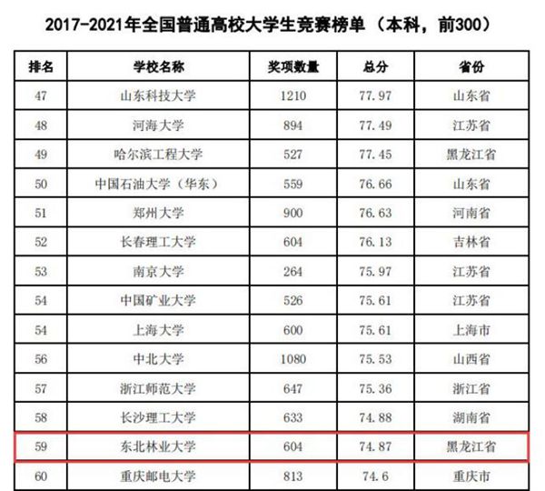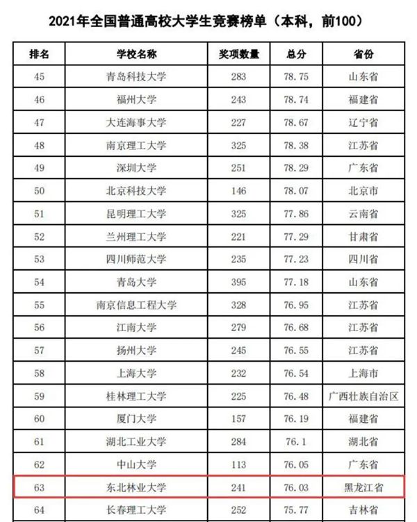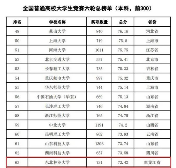 據(jù)悉,中國高等教育學(xué)會(huì)自2017年2月啟動(dòng)《高校競(jìng)賽評(píng)估與管理體系研究》項(xiàng)目以來,中國高等教育學(xué)會(huì)已經(jīng)連續(xù)發(fā)布六輪榜單,這是我國第一個(gè)專注高校創(chuàng)新人才培養(yǎng)暨學(xué)科競(jìng)賽成果的排行榜,是檢驗(yàn)高校人才培養(yǎng)質(zhì)量的重要途徑。為從更長(zhǎng)的時(shí)間段了解各高校大學(xué)生競(jìng)賽發(fā)展態(tài)勢(shì),特在今年發(fā)布了“六輪總榜單”,時(shí)間跨度從2012年到2021年,東北林業(yè)大學(xué)以總分73.42,位列全國第63位。