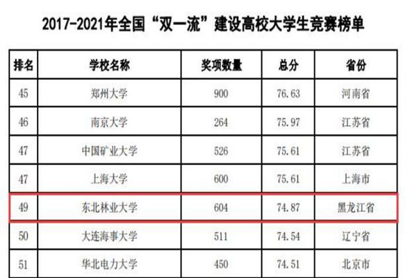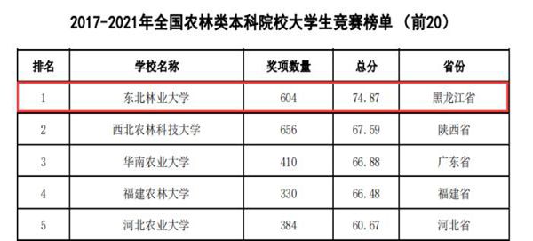 黑龍江經(jīng)濟(jì)網(wǎng)訊(黑龍江日?qǐng)?bào)全媒體見習(xí)記者董廣碩 商祺)近日,中國高等教育學(xué)會(huì)高校競(jìng)賽評(píng)估與管理體系研究工作組發(fā)布2021全國普通高校大學(xué)生競(jìng)賽分析報(bào)告,在《2017-2021年農(nóng)林類本科院校大學(xué)生競(jìng)賽排行榜TOP20》中。東北林業(yè)大學(xué)以總分74.87(獲獎(jiǎng)604項(xiàng))的優(yōu)異成績(jī)連續(xù)四年蟬聯(lián)榜首。