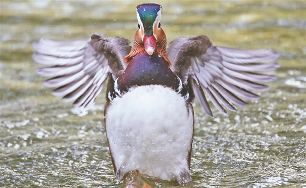每天早晚,車春虎都會把準(zhǔn)備好的麻籽、玉米、面包蟲等鳥食撒到湖上、岸邊,鴛鴦撒著歡覓食。吃完食兒,它們不時水上舒展羽翅,撲騰戲水,湖面上水花四濺,生機盎然。車春虎介紹,這些鴛鴦?wù)跒槟线w越冬做著體能儲備,每年10月中下旬它們就會離開繁殖地哈爾濱,飛到溫暖的南方越冬。