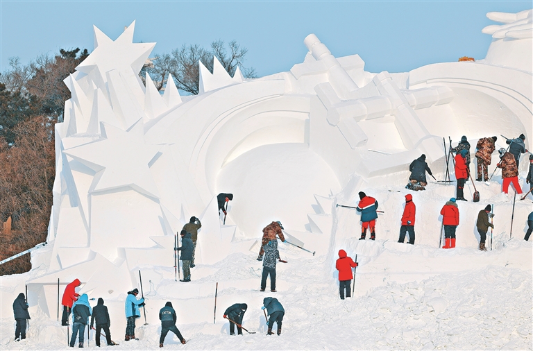 本報訊(記者 劉艷)記者從哈爾濱市太陽島風(fēng)景區(qū)獲悉,13日,第35屆哈爾濱太陽島雪博會大型主塑《逐夢》正式開鏟。主塑長100米,高33米,將由70余位雕刻師用一周左右的時間完成,用雪量近2.6萬立方米。