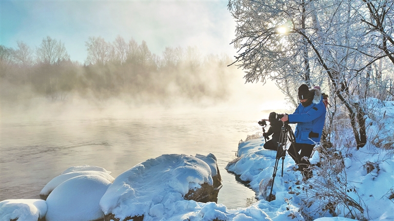 抬頭是凝霜掛雪的碧玉瓊枝,俯身是仙氣繚繞、終年不凍的庫爾濱河。這幾年,遜克大平臺(tái)霧凇景區(qū)聲名鵲起,每到冬季都能吸引一大批粉絲不遠(yuǎn)萬里而來。來自廣州市的游客王小雨說:“遜克大平臺(tái)的霧凇真的好漂亮,我已經(jīng)留意了幾年了,趁著2022年的年尾我終于趕過來看到了,比我想象中的還美!”同樣終年不凍的還有五大連池的溫泊,潔白的雪花覆蓋在黝黑的火山上,在天地間蕩漾開一幅水墨畫,游客可以邊泡溫泉邊賞雪。封凍的黑龍江遠(yuǎn)觀似一條玉帶,江面上也非常熱鬧,冬泳健將、滑冰健將各顯其能,江畔的冰雕雪雕賞心悅目。