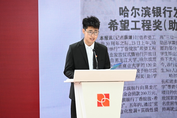 來自哈爾濱理工大學(xué)的獲獎學(xué)生程同學(xué)代表全體獲獎學(xué)生向共青團(tuán)、希望工程、哈爾濱銀行表示感謝,并表達(dá)了自己在課業(yè)之余會積極參加“丁香綻放·童心港灣”等志愿服務(wù)項目,把公益火種延續(xù)下去。
