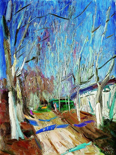 在諶北新的代表性作品里,無論何種結構,色調、筆觸、造型、線條都可以獨立觀賞。一塊厚堆的白色顏料,可以是云朵、是白墻,或是前后重疊的船帆。用筆的疏密、狀貌和節(jié)奏都有獨立存在的意義,既可以像欣賞書法用筆一樣拋開物象去體味,又可以去想象和填補與之恰合的物象和自然關系。諶北新對書法的深入研究和長期的繪畫寫生,以及他對物象、空間、色彩關系的觀察與創(chuàng)造實踐,使其作品能夠將不同的表現(xiàn)手法有機地融為一體。比如一筆畫下去,既表現(xiàn)空間層次,也體現(xiàn)厚薄輕重,同時展現(xiàn)光線的微妙變化。這種綜合性的呈現(xiàn)效果,實際上也契合著中國山水畫所追求的通過用筆的輕重緩急,通過虛實濃淡的墨色渲染,通過遠近高低的畫面布局,表現(xiàn)山水對人的情感與心靈的影響。而諶北新的風景油畫,正是基于中國人對山川草木的喜愛之情,通過體察和探求提煉出的獨特意象,它符合現(xiàn)代人的心理需求,也呼應著畫家畢生追求的藝術境界——須其自來,不以力構。