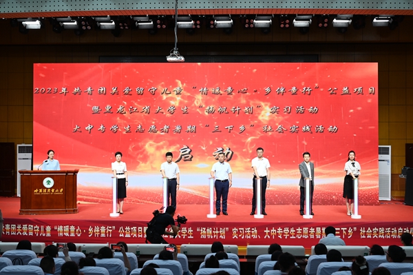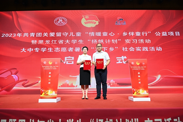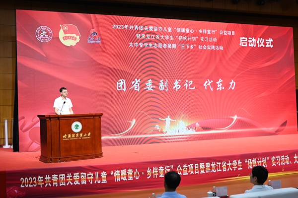 黑龍江經(jīng)濟(jì)網(wǎng)訊(王丹陽(yáng) 記者祝東)7月5日,2023年共青團(tuán)關(guān)愛(ài)留守兒童“情暖童心·鄉(xiāng)伴童行”公益項(xiàng)目暨黑龍江省大學(xué)生“揚(yáng)帆計(jì)劃”實(shí)習(xí)活動(dòng)、大中專學(xué)生志愿者暑期“三下鄉(xiāng)”社會(huì)實(shí)踐活動(dòng)啟動(dòng)儀式在哈爾濱商業(yè)大學(xué)隆重舉行。共青團(tuán)黑龍江省委副書記代東力、陳海平,哈爾濱商業(yè)大學(xué)副校長(zhǎng)姜國(guó)峰,省直機(jī)關(guān)團(tuán)工委書記趙明瑞,黑龍江省人力資源和社會(huì)保障廳、省知識(shí)產(chǎn)權(quán)局、省人民檢察院、省青少年發(fā)展基金會(huì)、哈爾濱市南崗區(qū)民政局、哈爾濱海關(guān)、哈爾濱海事局相關(guān)領(lǐng)導(dǎo),以及哈爾濱商業(yè)大學(xué)的志愿者和哈爾濱市樂(lè)業(yè)小學(xué)師生代表參加本次活動(dòng)。