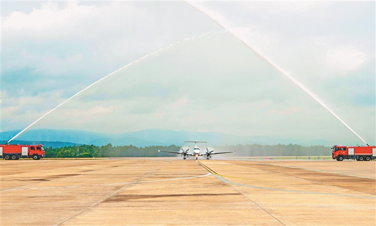 伴隨著飛機的轟鳴聲,命名為“林都號”的國王350飛機平穩(wěn)降落林都伊春,緩緩駛向林都機場5號停機坪。當飛機落地脫離跑道后,左右兩側(cè)的消防車開始噴射水霧,兩束水霧相互交錯,以“水門禮”熱烈歡迎乘坐“林都號”來伊春的游客。