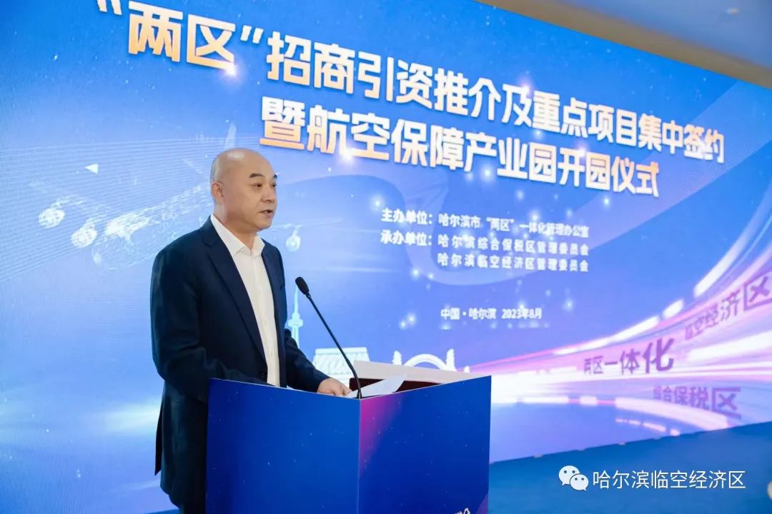 “兩區(qū)”管委會(huì)領(lǐng)導(dǎo)分別對(duì)哈爾濱綜合保稅區(qū)與哈爾濱臨空經(jīng)濟(jì)區(qū)重點(diǎn)園區(qū)、營(yíng)商環(huán)境、產(chǎn)業(yè)政策等特色優(yōu)勢(shì)作招商推介,誠(chéng)邀五湖四海的客商朋友來“兩區(qū)”投資興業(yè)、共商發(fā)展,吸引和促進(jìn)優(yōu)質(zhì)資源和高端要素匯聚“兩區(qū)”。哈爾濱臨空經(jīng)濟(jì)區(qū)航空保障產(chǎn)業(yè)園在全體來賓的見證下正式啟動(dòng),該園總建筑面積12萬平方米,總投資5.6億元,重點(diǎn)發(fā)展航空總部經(jīng)濟(jì)、航空制造產(chǎn)業(yè)、航空物流產(chǎn)業(yè)、臨空制造產(chǎn)業(yè)以及航空服務(wù)、航空食品等產(chǎn)業(yè),致力打造為哈爾濱臨空經(jīng)濟(jì)區(qū)發(fā)展現(xiàn)代制造業(yè)的新名片,成為國(guó)內(nèi)知名的航空保障產(chǎn)業(yè)集群。