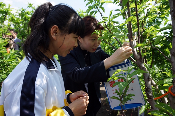儀式后,與會領(lǐng)導(dǎo)和孩子們一同參觀青春果園,在“希望”“圓夢”“愛心”等六棵樹下共同掛上“哈藥小藍(lán)瓶”手工制品。
