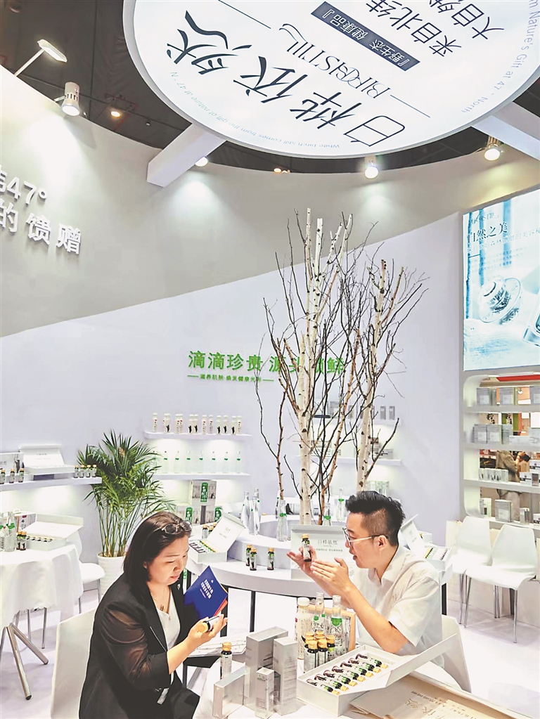“產(chǎn)品所用的白樺汁原料源自鐵力市,這里處在北緯47°小興安嶺的黑土地上?!焙邶埥陼钥萍加邢薰究偨?jīng)理馬光西介紹,公司充分利用龍江“九珍十八品”資源,由雨曉集團與清華大學深圳科研團隊合作,運用先進技術開發(fā)提煉出白樺汁精華,為消費者不斷提供囗感獨特的綠色飲品、化妝品?,F(xiàn)在企業(yè)庫存清空,鐵力工廠正加班加點生產(chǎn)。本次展會的火爆出圈,讓企業(yè)對白樺汁系列產(chǎn)品走向世界市場更加充滿信心。