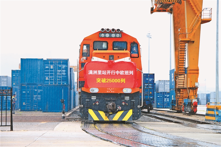 滿洲里是我國最大的陸路邊境口岸城市,經(jīng)由滿洲里鐵路口岸通行的中歐班列約占全國口岸通行總量的三成。隨著共建“一帶一路”倡議的深入推進(jìn),中歐班列跑出高質(zhì)量發(fā)展的新速度,數(shù)據(jù)顯示,自2013年中歐班列首次經(jīng)由滿洲里鐵路口岸開行以來,該口岸中歐班列通行量達(dá)到10000列用時(shí)超過7年,而從10000列到25000列僅用了三年時(shí)間,2023年滿洲里鐵路口岸年通行量首次突破5000列,班列通行量、貨物運(yùn)送量連續(xù)10年實(shí)現(xiàn)增長。