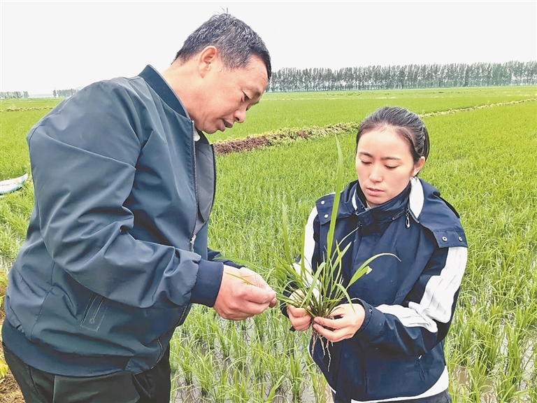 農(nóng)技專家在查看水稻秧苗。孫永凡攝