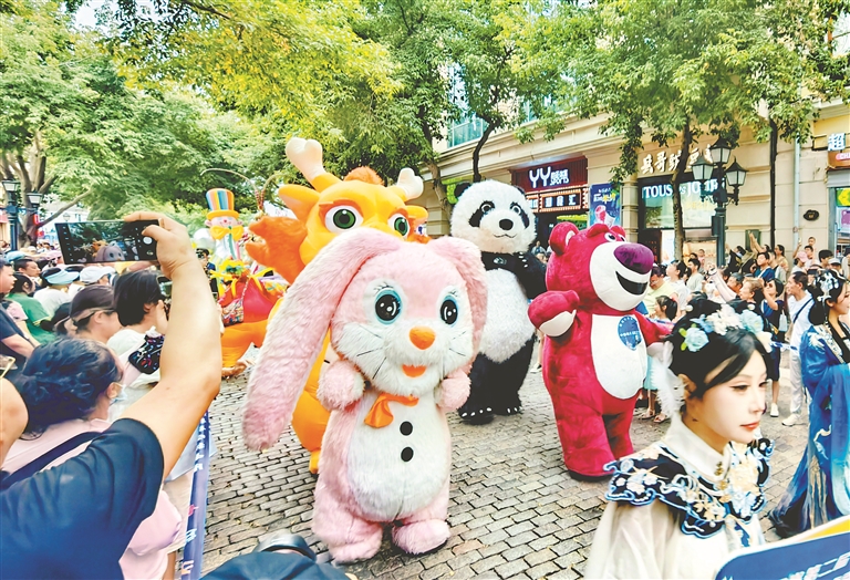 14日下午,哈爾濱市道里區(qū)中央大街上舉行了巡游活動,吸引游客們駐足觀看、拍照。