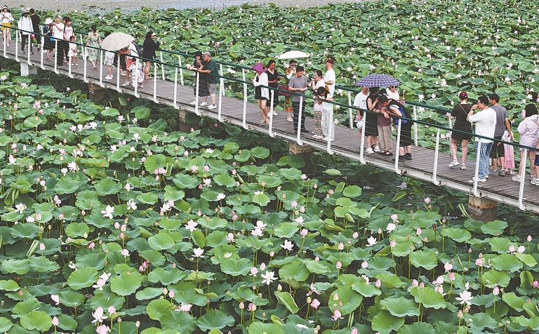 近日,哈爾濱文化中心濕地公園內(nèi)荷花綻放,吐露出它們的花苞,風(fēng)過(guò)荷塘帶來(lái)陣陣荷香,荷葉上的露水滴落,發(fā)出清脆的聲音,整個(gè)荷花池塘展現(xiàn)出夏天獨(dú)有的生機(jī)。這滿塘的荷花爭(zhēng)奇斗艷,吸引眾多游客、市民前來(lái)賞花打卡。數(shù)條觀光棧道延伸至濕地深處,人們走在棧道上,近距離觀看野鴨子、白骨頂雞等野生鳥(niǎo)類,與蘆葦、荷花等水生植物親密接觸。
