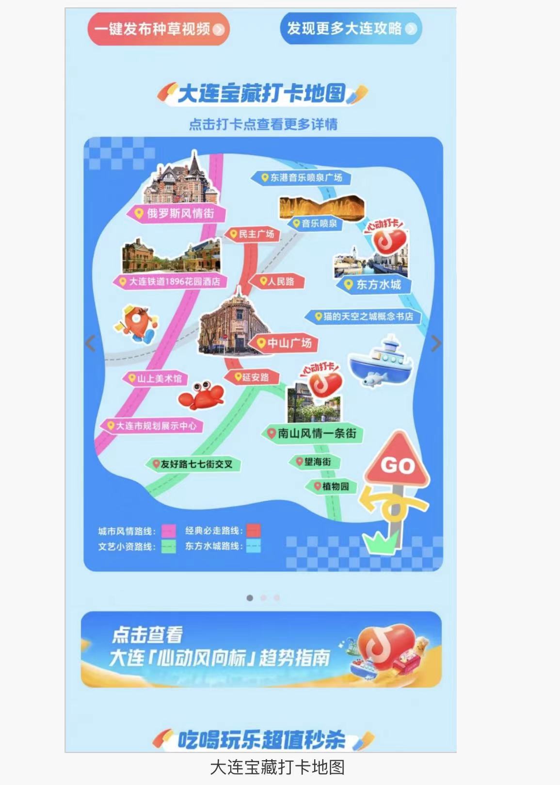 線上推廣方面,大連市文化和旅游局與抖音生活服務(wù)共同搭建“心動(dòng)大連”話題頁(yè)與“活動(dòng)主會(huì)場(chǎng)”頁(yè)面,聚合達(dá)人、用戶、媒體的多樣化內(nèi)容以及本地精選文旅商家,集中推廣大連文旅資源和特色消費(fèi)場(chǎng)景。費(fèi)啟鳴、婁藝瀟、喜劇人大鎖等多位大連籍明星藝人,受邀作為“心動(dòng)大連推薦官”為大連文旅打Call?;顒?dòng)將發(fā)起“心動(dòng)直播周”促消費(fèi)專場(chǎng)直播,設(shè)定周播主題,宣傳城市吃喝玩樂特色內(nèi)容。活動(dòng)還將結(jié)合大連文旅特色以及中秋節(jié)點(diǎn),發(fā)起“海邊的大連有多浪漫”“中秋來大連實(shí)現(xiàn)海鮮自由”等熱門話題造勢(shì)。(抖音)