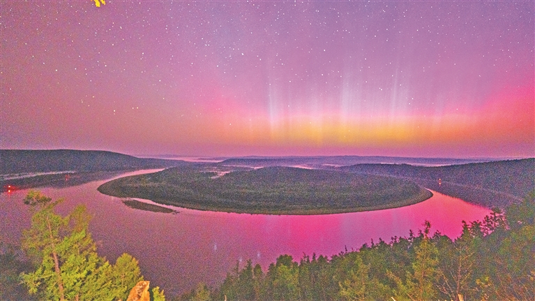 北極光輝映龍江第一灣。安石春攝