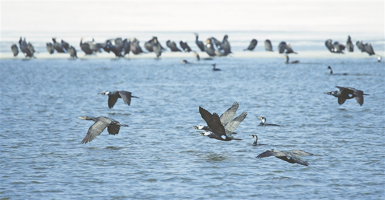 近日,松花江哈爾濱段出現(xiàn)大群的鸕鶿,它們在冰融的松花江上聚在一起,觀察著江面魚類的蹤跡,一旦發(fā)現(xiàn)魚群,近千只鸕鶿就快速游過去,潛水捕起“開江魚”。