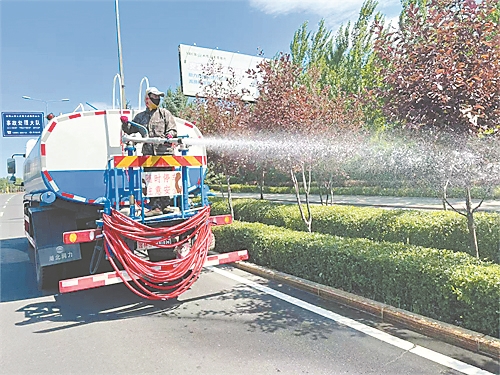 灑水車(chē)在澆灌綠植。張涵攝