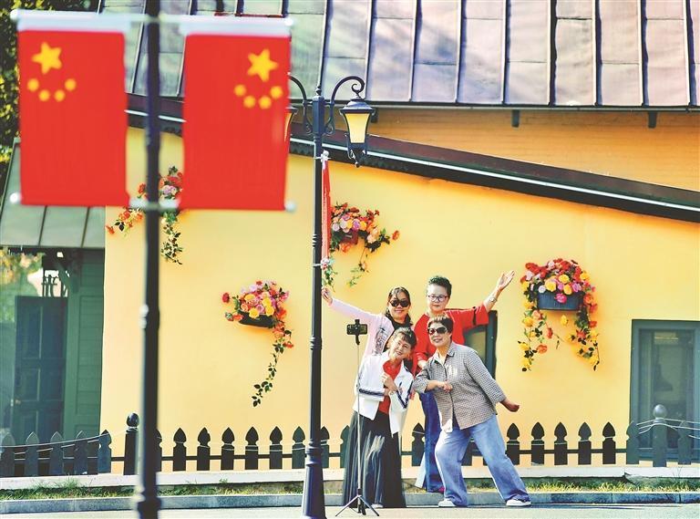 2日,哈爾濱市南崗區(qū)花園街歷史文化街區(qū),節(jié)日氣氛濃厚,游客們紛紛在“黃房子”旁打卡拍照。