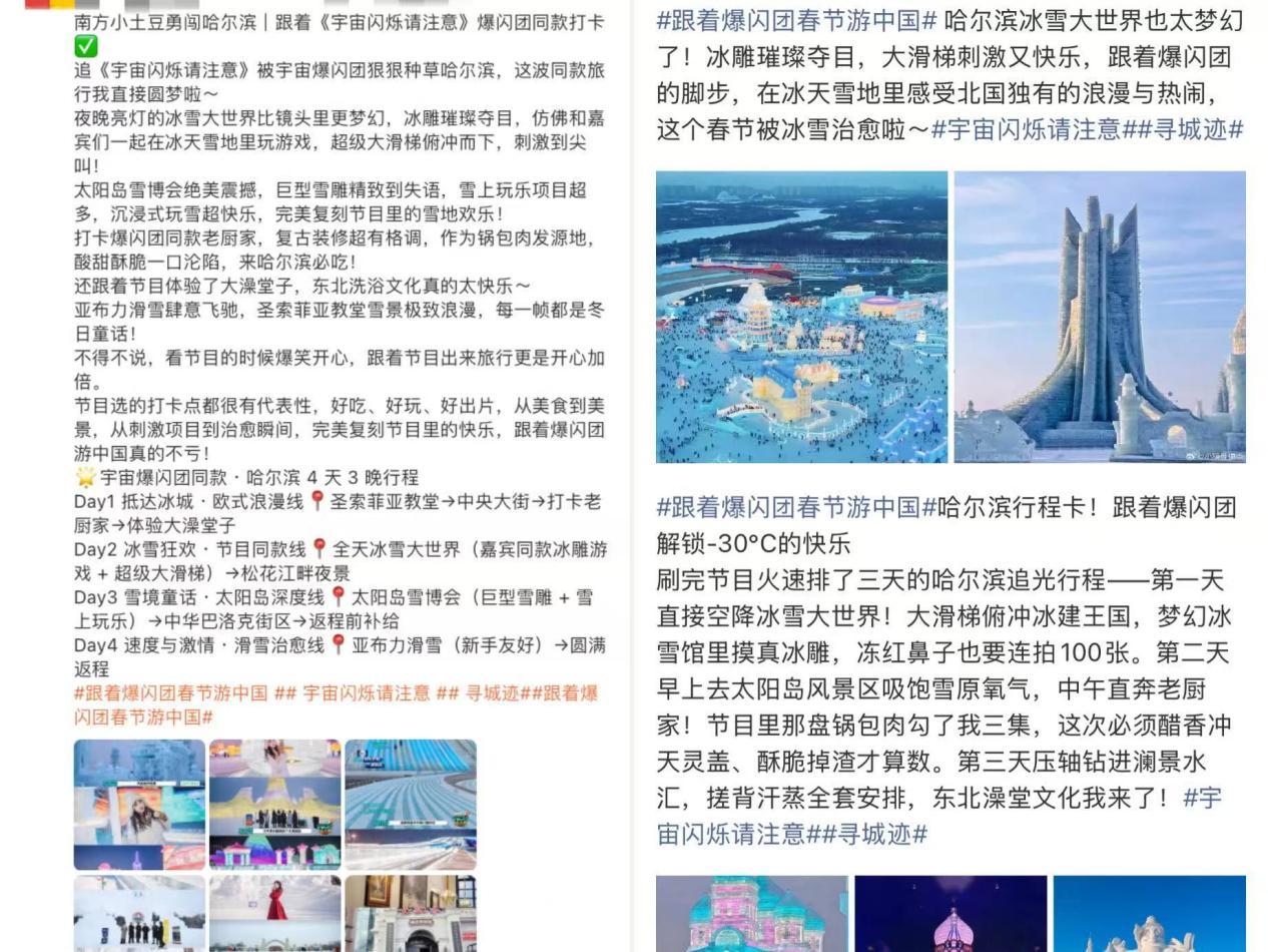 “跟著爆閃團春節(jié)游中國”打卡活動的開展,讓屏幕里的冰雪快樂照進了現(xiàn)實。游客們紛紛追隨宇宙爆閃團的腳步,在冰雪大世界打卡拍照,在太陽島雪博會邂逅巨型雪雕,在亞布力滑雪場體驗飛馳的快樂,在老廚家品嘗節(jié)目同款美食。